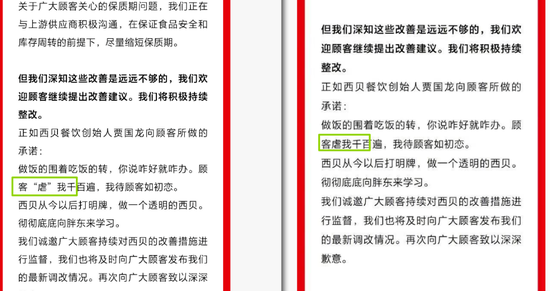 记者注意到,西贝发布致歉信后不久又删除重发,第二次发布的致歉信有修改:“顾客虐我千百遍”改为“顾客‘虐’我千百遍”,虐字增加了引号。