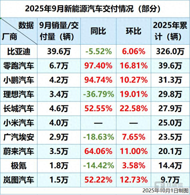 钛媒体App 10月1日消息,车企公布今年9月新能源汽车的交付情况,7家交付量超3万,5家同比增超50%。其中景逸策略,比亚迪交付39.6万辆,同比下降5.52%,环比增长6.06%,全年交付破326万;零跑交付6.7万辆,同比增长97.40%,环比增长16.81%,月交付首次突破六万;小鹏交付4.2万辆,同比增长94.74%,环比增长10.27%,单月交付量创历史新高;理想交付3.4万辆,同比下降36.79%,环比增长19.01%;小米交付超4.0万辆,目前已连续11个月交付量超2万。(钛度车库)