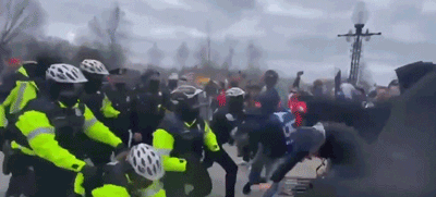 抗议者与维持秩序的警察发生暴力冲突,抗议者推翻了国会大厦西侧的路障。图自《华盛顿邮报》