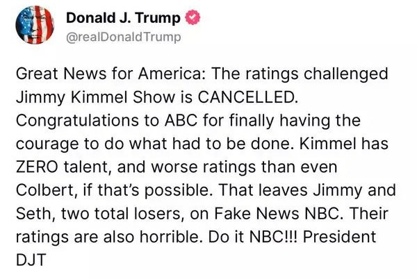 但是,“吉米鸡毛秀”当年并没有因为这种明显的种族主义反人类言论而关门;导致这个节目被叫停的,是因为前几天节目上说特朗普政府正假惺惺地利用这场刺杀案来谋取政治利益。老实说,“吉米鸡毛秀”的这些言论已经非常尊重查理·柯克了,他们没有像很多自由派那样幸灾乐祸说查理·柯克是咎由自取,而仅仅是担心他在死后被人利用——但仍然,一旦被特朗普当作反面典型点了名,那从联邦机构到广播公司就都容不下他了。